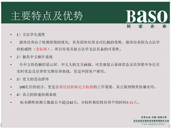 貝索全自動(dòng)分枝桿菌培養(yǎng)檢測(cè)儀充分考慮國(guó)內(nèi)現(xiàn)狀,根據(jù)客戶需求,分為BS-100型、BS-400型、BS-1000型,滿足不同標(biāo)本量客戶需求,為廣大基層醫(yī)療機(jī)構(gòu)---基層綜合醫(yī)院、基層專科醫(yī)院、基層定點(diǎn)機(jī)構(gòu)、基層結(jié)核病實(shí)驗(yàn)室提供分枝桿菌液體快速檢測(cè)平臺(tái)及服務(wù)。